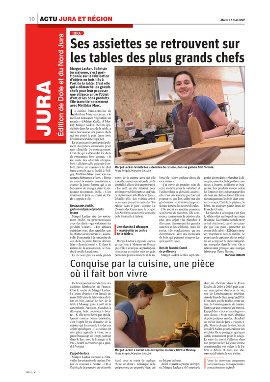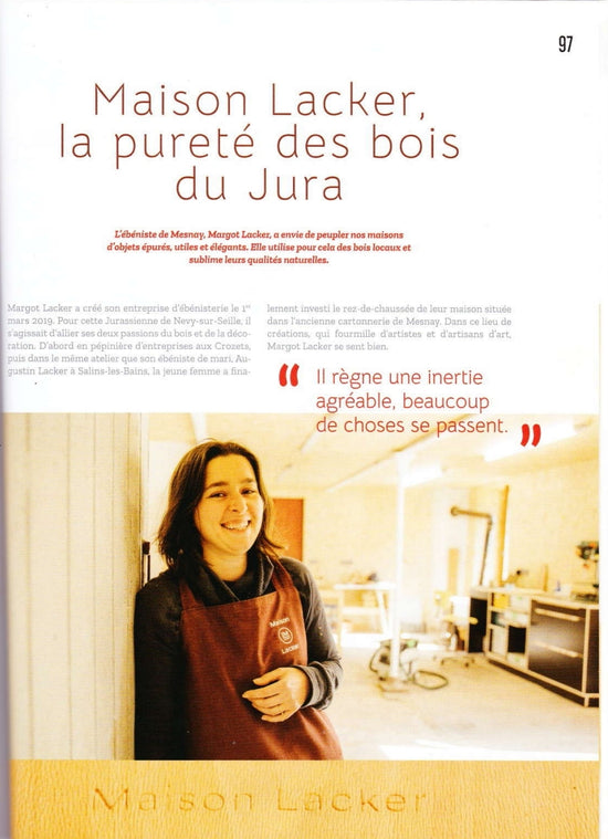 Maison Lacker, la pureté des bois du jura. L’ébéniste de Mesnay, Margot Lacker, a envie de peupler nos maisons d’objets épurés, utiles et élégants. Elle utilise pour cela des bois locaux et sublime leurs qualités naturelles.