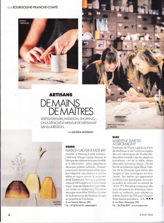 Formée à l’ébénisterie et au tournage, Margot Lacker a créé, en 2020, au cœur du Jura, un atelier où elle conçoit des objets d’usage à partir de bois provenant de scieries locales.