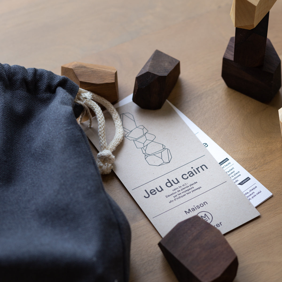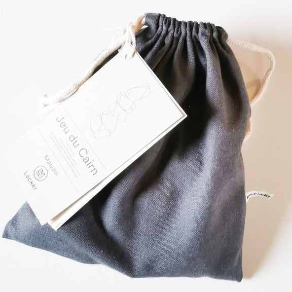 Les pierres de votre jeu du cairn sont toutes différentes, chaque lot comprend donc un ensemble de pièces uniques. Pour le rangement de vos cailloux en fin de partie, un sac en coton recyclé certifié Oeko-Tex cousu en Franche-Comté, est fourni avec chaque jeu.