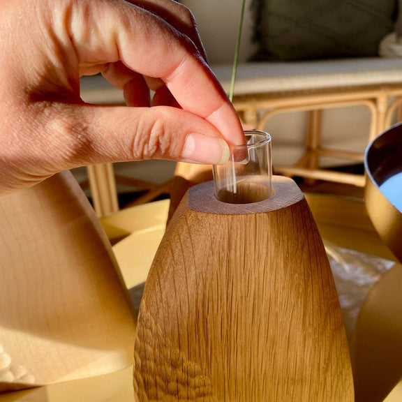 Grâce à son tube en verre discret, il accueille aussi bien des fleurs fraîches que des végétaux séchés, et devient un petit rituel du quotidien. Le geste de remplir le tube, d’y glisser une fleur, suffit à ancrer un instant de calme dans votre journée.