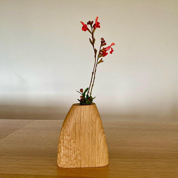 Ce soliflore sculpté n’est pas qu’un vase : c’est un objet d’émotion, un souffle de poésie posé sur une étagère. Tourné et sculpté à la main dans un bois local, il mêle la matière brute et le geste lent de l’artisanat. Sa présence douce et organique capte la lumière, souligne le vide, donne de la valeur à ce qui semble fragile : une tige fraîchement cueillie, un rameau d’eucalyptus, une fleur séchée.